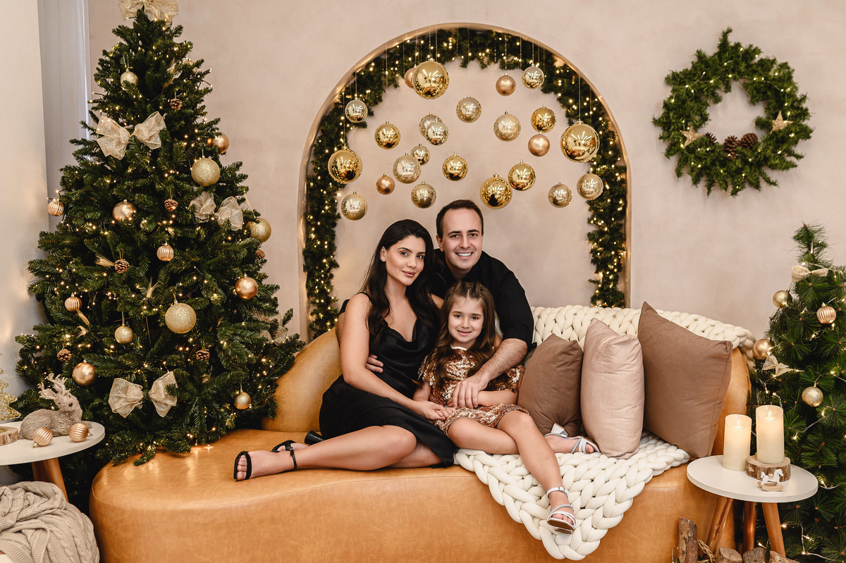 Cada detalhe foi pensado com carinho para transmitir a leveza e o aconchego dessa época tão especial, o brilho das luzes, o toque dourado dos enfeites e o conforto do sofá compõem o cenário perfeito para guardar suas memórias de Natal com muito amor.